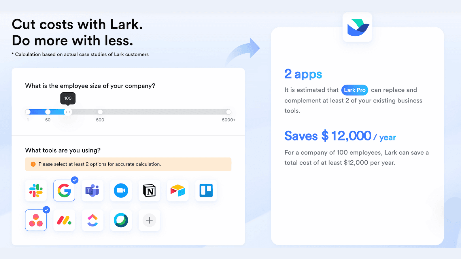 Lark의 가격은 전반적으로 더 저렴하여 스타트업과 소규모 기업에 적합합니다. 프로 요금제는 사용자당 월 $12부터 시작하며, 이는 Asana의 고급 및 엔터프라이즈 요금제보다 저렴합니다.