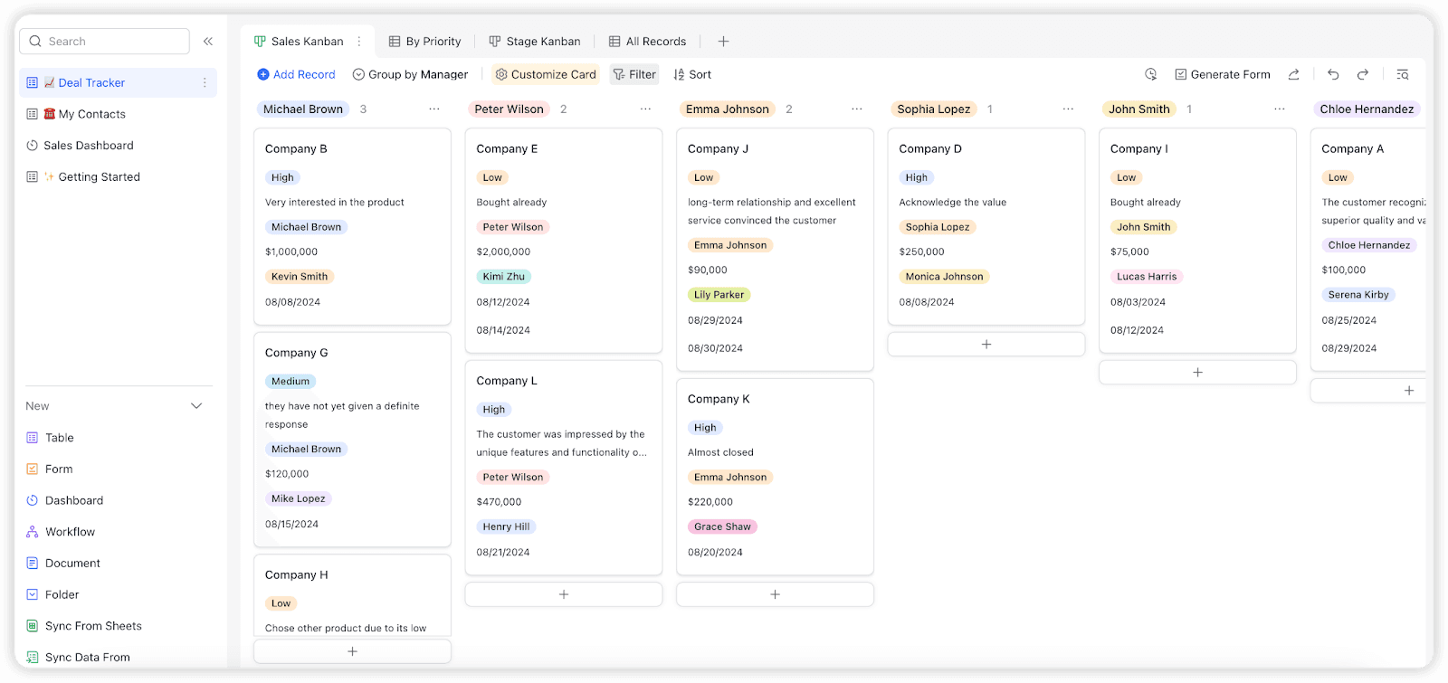 Lark은 11개 이상의 네이티브 도구에 모두 원활하게 통합된 무료 요금제를 제공하여 스타트업과 소규모 비즈니스에 탁월한 선택입니다. 이 CRM 기능은 커뮤니케이션, 문서 협업, 프로젝트 추적을 포함하는 더 넓은 스위트의 일부로, 예산이 제한된 성장하는 팀에 비용 효율적이고 올인원 솔루션을 제공합니다.
