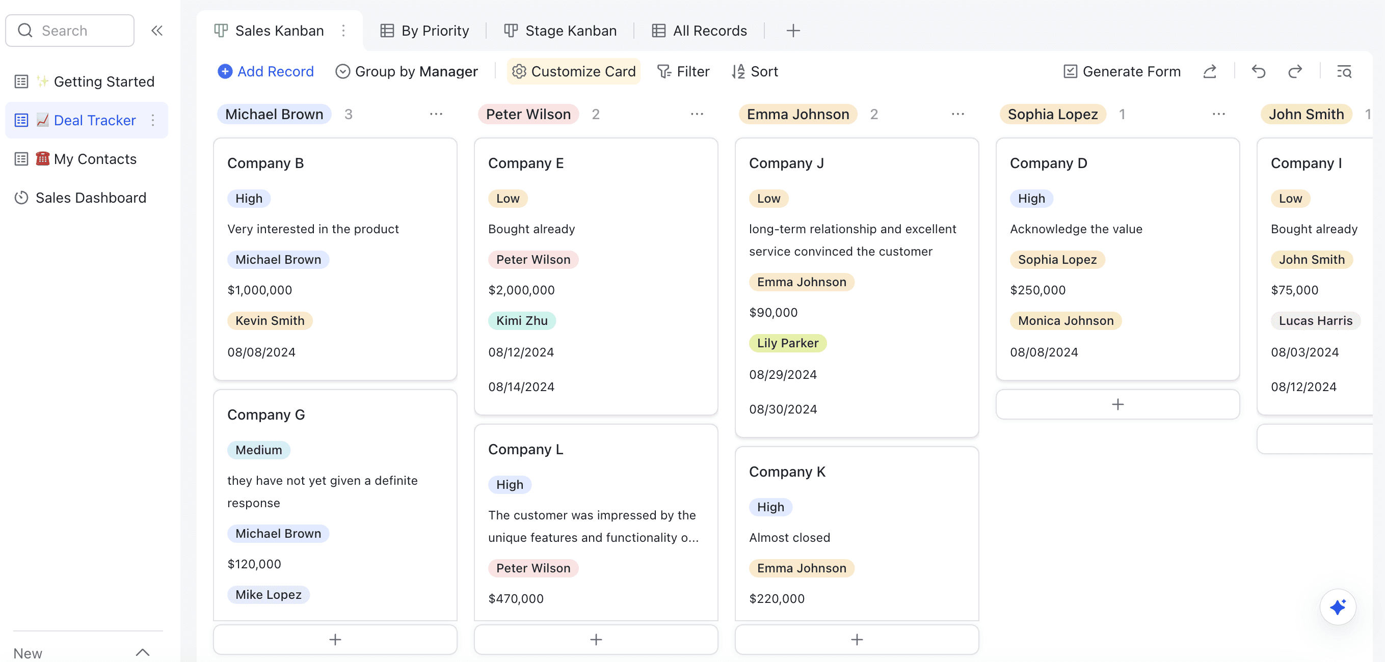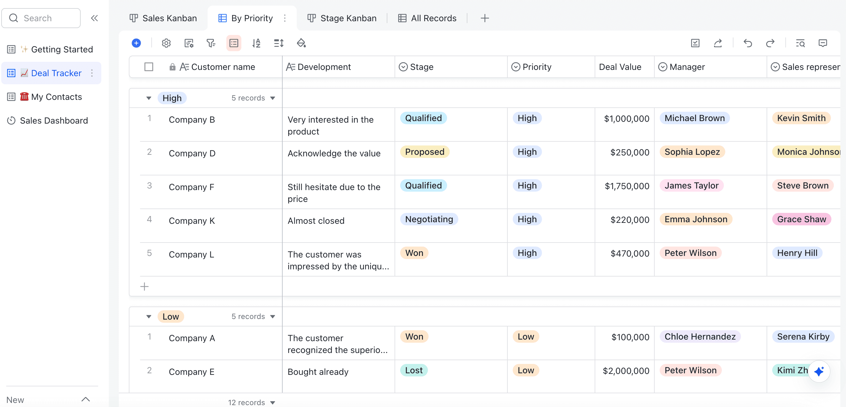 Kanban 보기(위 사진)에서 영업 담당자별 거래를 보는 것 외에도, 기업은 표 보기에서 우선순위별로 거래를 정렬할 수 있습니다…