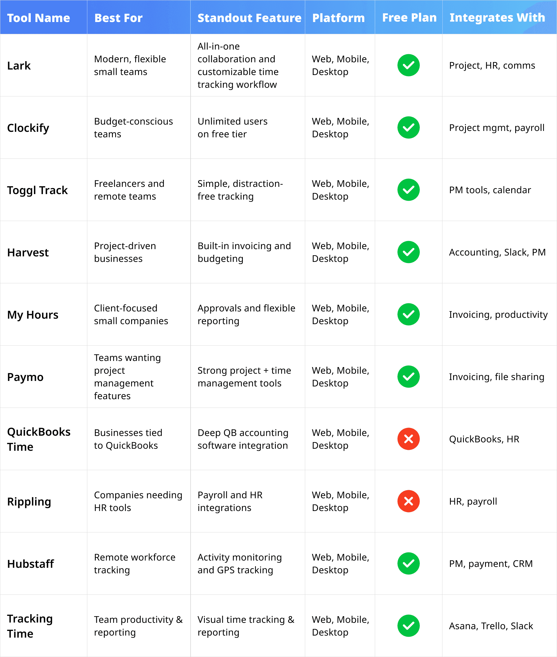 Lark는 단순한 시간 추적 솔루션을 넘어 출석, 교대 근무 일정, 승인, 커뮤니케이션 및 맞춤형 데이터베이스를 하나의 클라우드 기반 플랫폼에 통합한 종합 디지털 작업 공간입니다. Lark는 직원 시간 관리의 모든 측면을 간소화하고 효율적으로 처리하려는 소규모 비즈니스를 위해 설계되었으며, 고급 시간 추적 앱과 자동화된 시간 추적을 사용하여 진정한 팀워크와 투명성을 촉진합니다.