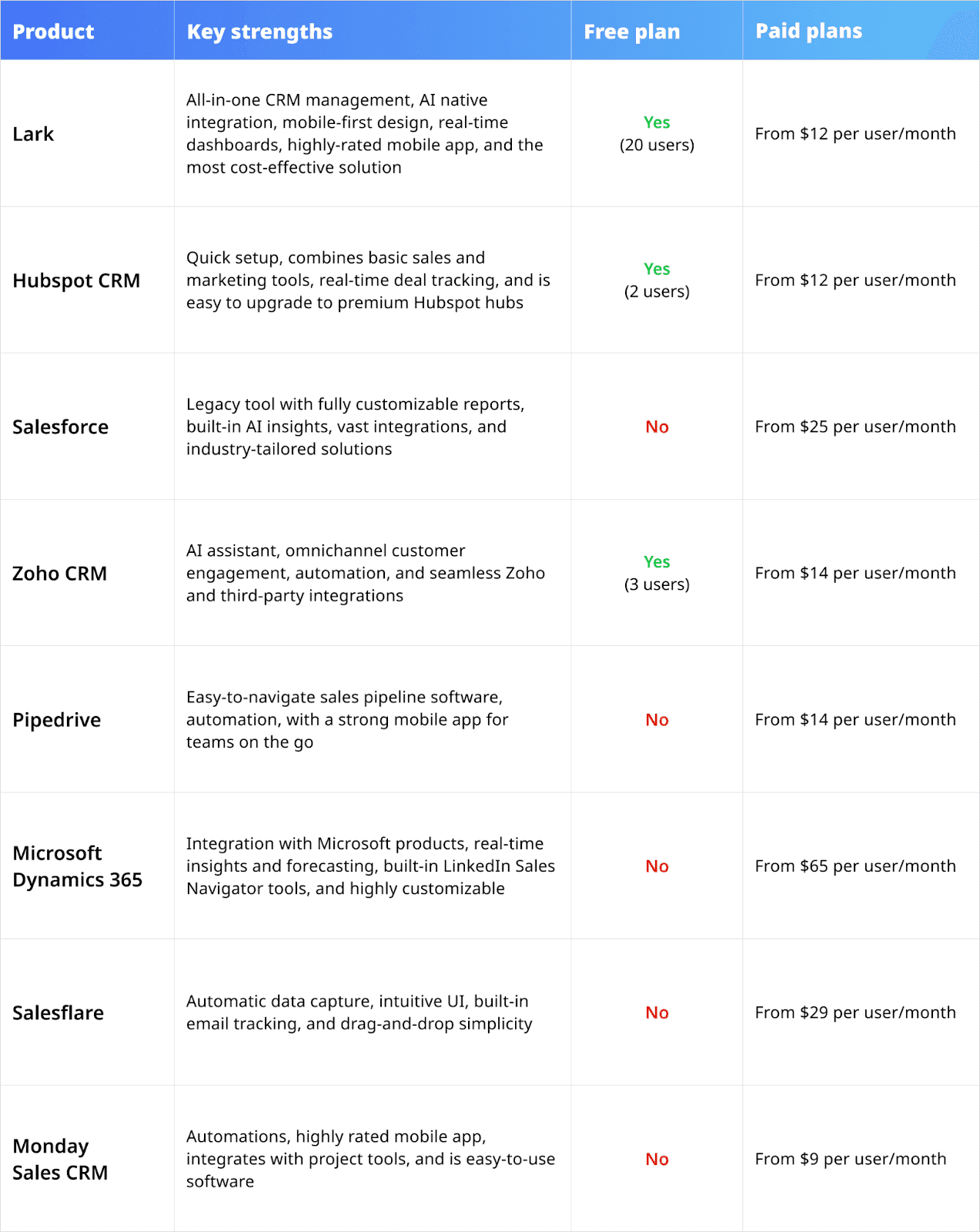 다음은 최고의 CRM 앱을 간단히 살펴보며 주요 강점, 가격, 무료 요금제 포함 여부를 비교한 내용입니다.