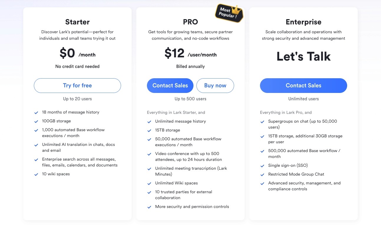 Lark는 가격 및 기능을 비교할 때 가장 비용 효율적인 CRM 솔루션으로 돋보입니다.