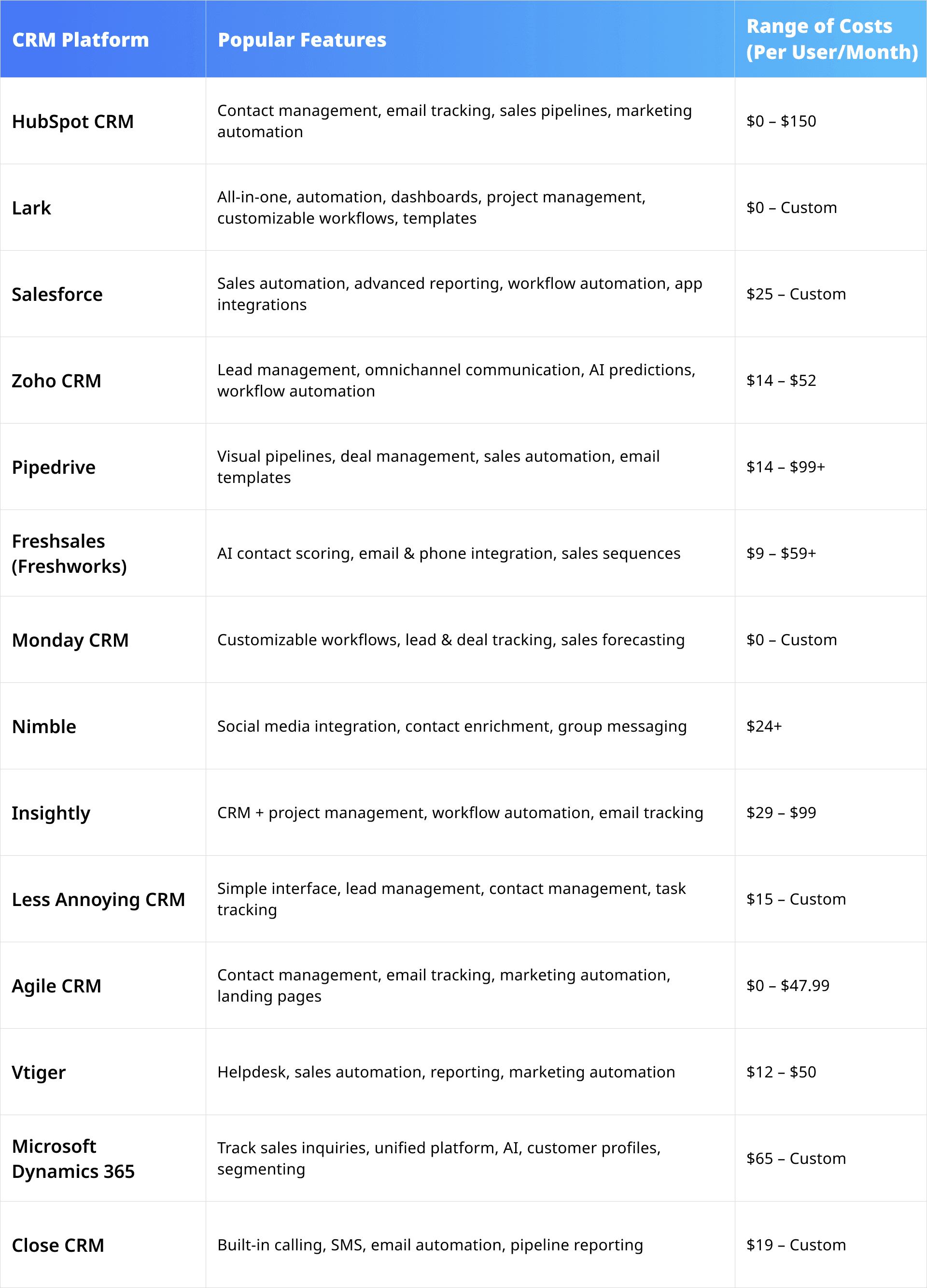 프리미엄 요금제: HubSpot CRM과 Lark 같은 플랫폼에서 제공됩니다. 기본 CRM 기능을 무료로 이용할 수 있습니다. 그러나 일부 플랫폼은 마케팅 자동화나 보고서 작성과 같은 고급 도구를 제한하여 비즈니스가 확장됨에 따라 업그레이드를 요구할 수 있습니다.