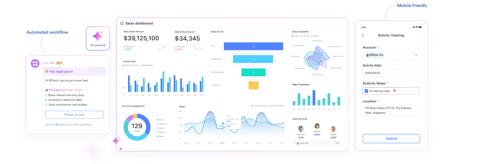 Lark는 이러한 미래 트렌드와 완벽하게 부합하는 선도적인 맞춤형 CRM 솔루션으로 돋보입니다. AI 기반 분석을 통해 Lark는 참여 전략을 향상시키기 위한 실행 가능한 인사이트를 제공합니다. 플랫폼의 고급 자동화 기능은 일상적인 작업을 간소화하여 팀이 우선순위가 높은 활동에 집중할 수 있는 소중한 시간을 확보해 줍니다.