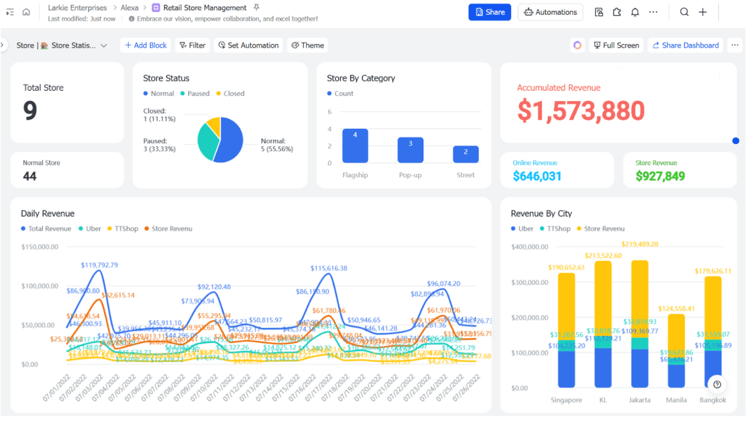 Lark는 커뮤니케이션, 워크플로우 자동화 및 데이터 관리를 하나의 원활한 디지털 작업 공간으로 통합하도록 설계된 올인원 협업 및 생산성 플랫폼입니다. 복잡한 운영을 단순화하고 실시간 팀워크를 촉진하는 능력 덕분에 소매업과 외식업에서 빠르게 인기를 얻고 있습니다.