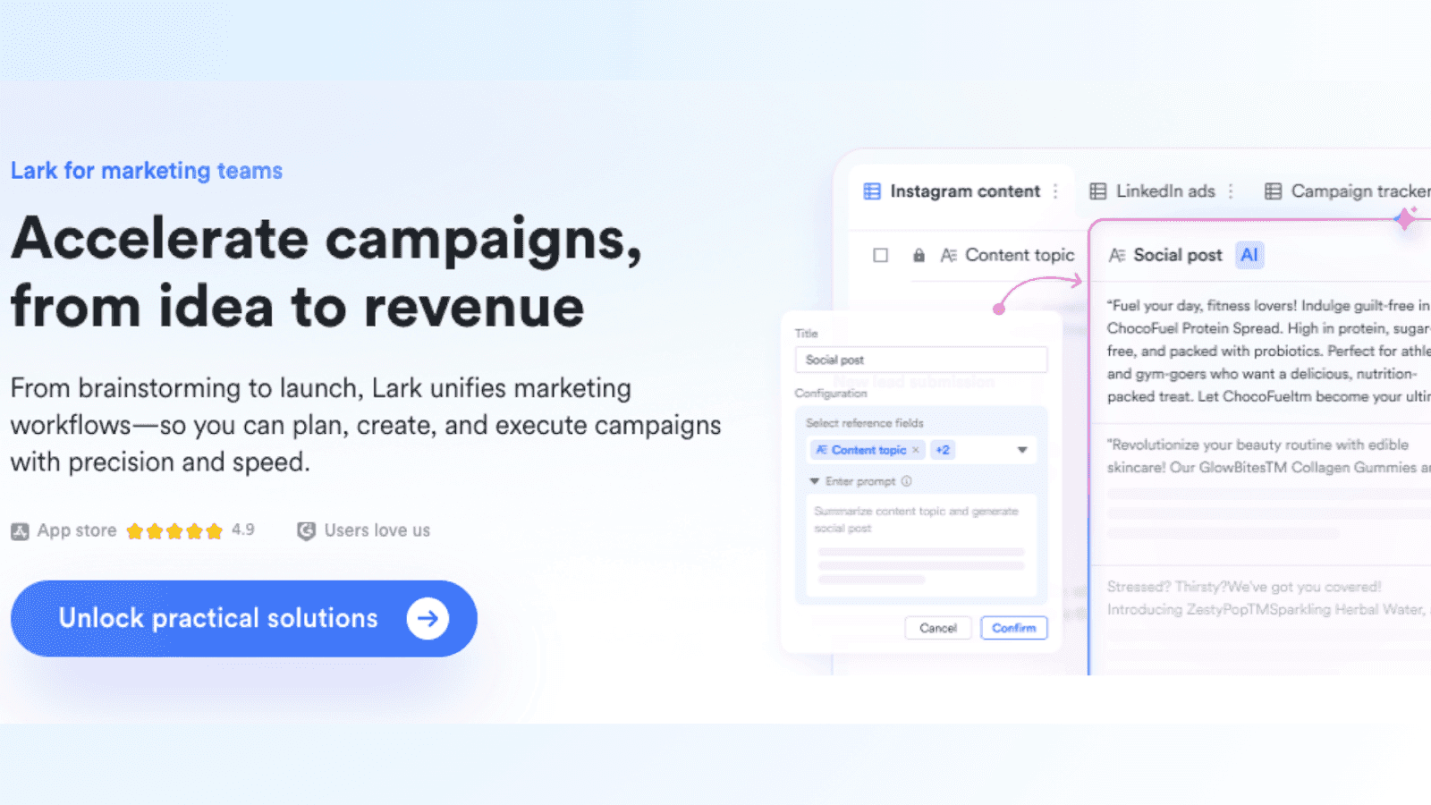Lark의 통합 접근법은 원활하게 함께 작동하는 통합 도구를 통해 중소기업 마케팅의 일반적인 문제를 해결합니다. 다음은 Lark가 포괄적인 마케팅 관리를 위한 최고의 도구 중 하나로 돋보이게 하는 주요 기능들입니다: