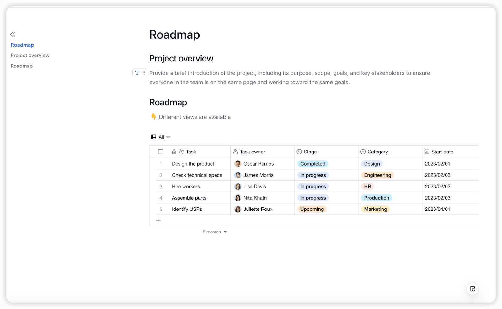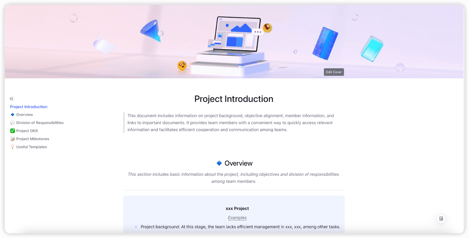 이 템플릿은 팀이 명확하고 간결한 프로젝트 소개를 작성하는 데 도움을 주며, 목표, 주요 세부 사항 및 예상 결과를 개요로 제시합니다. 프로젝트 범위, 이해관계자 및 일정 등을 문서화할 수 있는 중앙 집중식 공간을 제공하여 시작부터 일치된 방향을 보장합니다. 구조화된 개요를 제공함으로써 의사소통을 개선하고 실행을 위한 견고한 기반을 마련합니다. 명확하게 정의된 프로젝트 개요가 필요한 프로젝트 관리자와 팀에 이상적입니다.