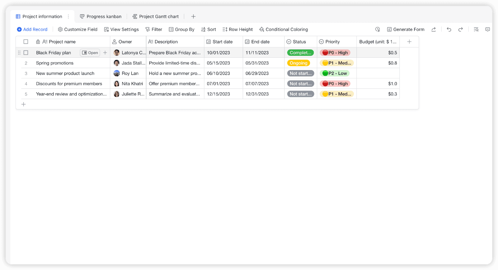 Lark Base: 프로젝트 정보 관리