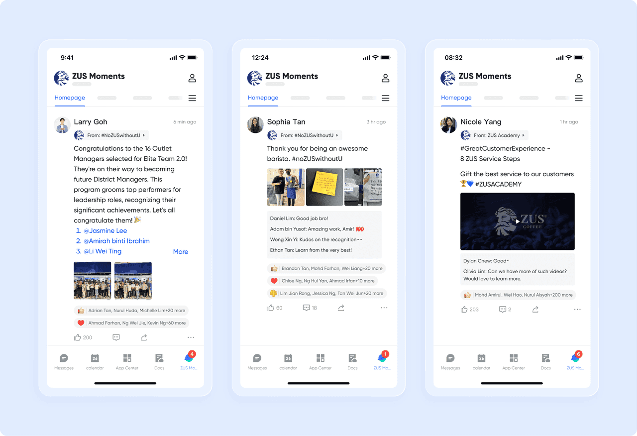 6,000명 이상의 직원을 보유한 ZUS Coffee는 속도를 유지하면서도 문화적 결속을 잃지 않아야 했습니다. 이는 현장 팀이 며칠 후가 아니라 즉시 소식을 받을 수 있는 실시간 커뮤니케이션 모델을 구축하는 것을 의미했습니다.