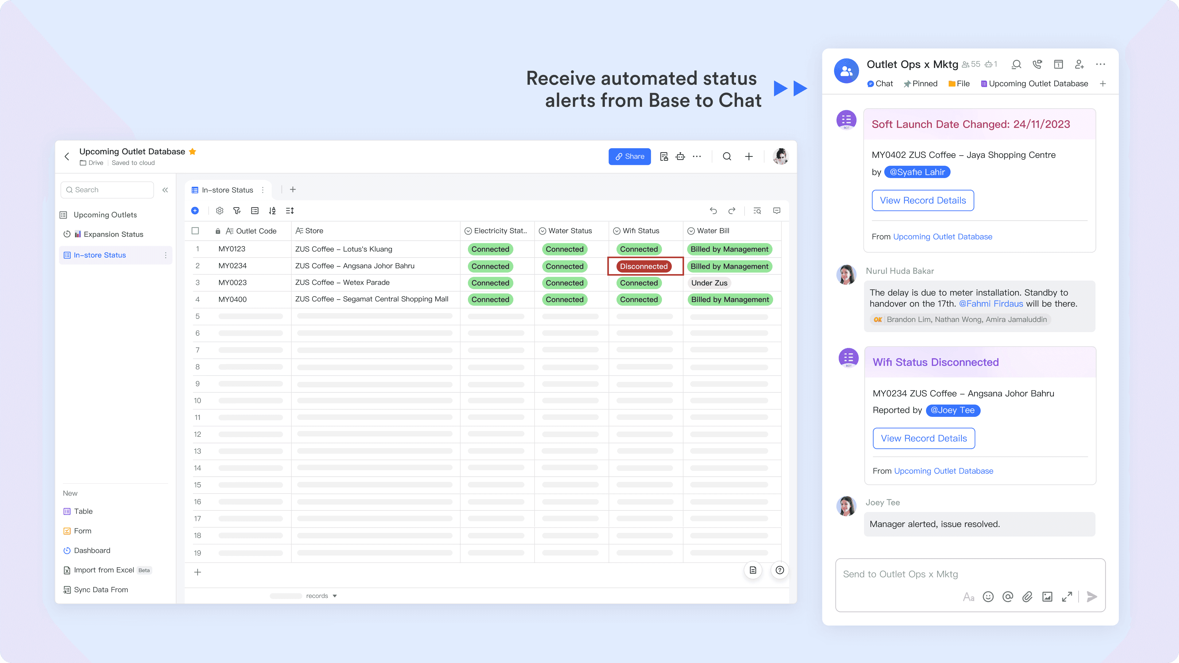 ZUS Coffee의 초기 확장 단계에서는 조정에 어려움이 있었습니다. 각 신규 매장 오픈에는 30명 이상의 이해관계자—내부 팀, 계약자, 공급업체—의 의견이 필요했으며, 중앙 시스템이 없어서 업데이트가 WhatsApp, Telegram 등 여러 앱에 분산되어 있었습니다.