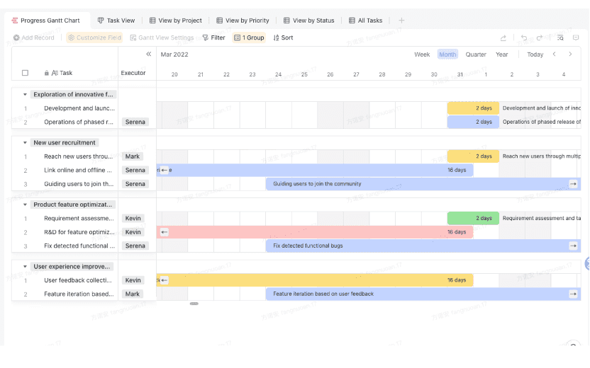 모든 프로젝트 관리 도구에서 핵심 기능은 일정과 타임라인을 시각적으로 표현하는 능력입니다. 간트 차트는 작업 간 의존성과 전체 진행 상황을 시각화하는 데 필수적입니다. 이러한 도구는 팀이 상세한 프로젝트 일정을 작성하고 관리하여 정확한 일정 수립과 효과적인 프로젝트 타임라인 관리를 보장하도록 돕습니다. Lark를 포함한 많은 Microsoft Project 대체품은 사용자 친화적인 간트 차트 기능을 제공합니다. 이를 통해 팀은 프로젝트 타임라인을 쉽게 추적하고 체계적인 작업 흐름을 유지할 수 있습니다.
