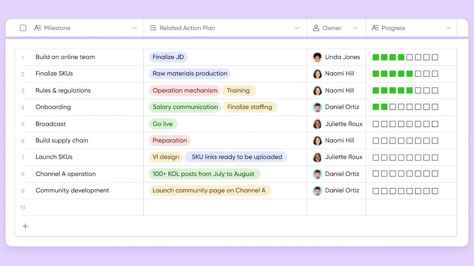 우리의 제품 개발 진행 관리 템플릿으로 불확실한 프로젝트 일정을 관리하세요. 이 템플릿은 유연한 일정의 작업을 추적하고 주요 마일스톤 대비 진행 상황을 모니터링할 수 있게 해줍니다. 낙관적 또는 비관적 추정치를 기록할 수 있는 사용자 지정 필드를 사용하여 일정이 자주 변경되는 혁신적인 연구개발 프로젝트의 예측 불가능성을 관리할 수 있습니다.