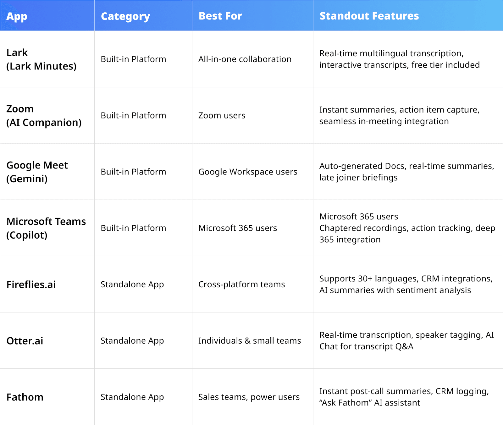 적합한 선택을 돕기 위해, 2025년 최고의 AI 회의 비서 앱 7가지를 두 가지 범주로 나누었습니다: 인기 있는 화상 회의 플랫폼에 내장된 도구와 다양한 회의 서비스에서 작동하는 독립형 앱입니다. 최선의 선택은 팀의 작업 방식에 따라 다릅니다—어떤 팀은 이미 화상 회의 플랫폼에 내장된 도구를 선호할 수 있고, 다른 팀은 어떤 통화에도 참여할 수 있는 더 유연한 도구가 필요할 수 있습니다. 아래에서는 각 앱의 주요 기능, 장단점, 통합 옵션 및 가격을 자세히 설명하겠습니다.
