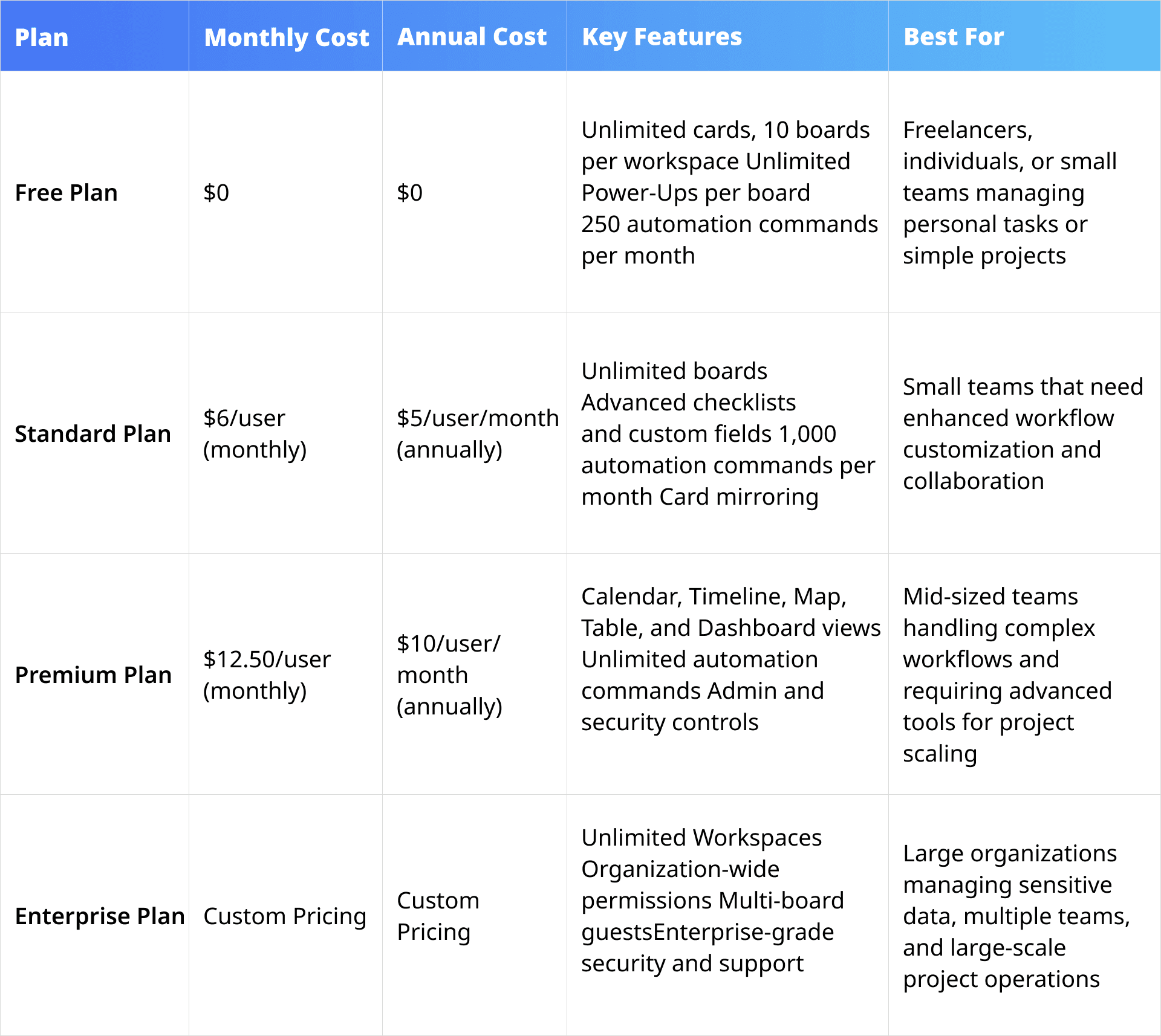 Trello 요금제를 한눈에 비교하면 각 요금제의 비용, 핵심 기능 및 이상적인 사용 사례를 쉽게 확인할 수 있습니다: